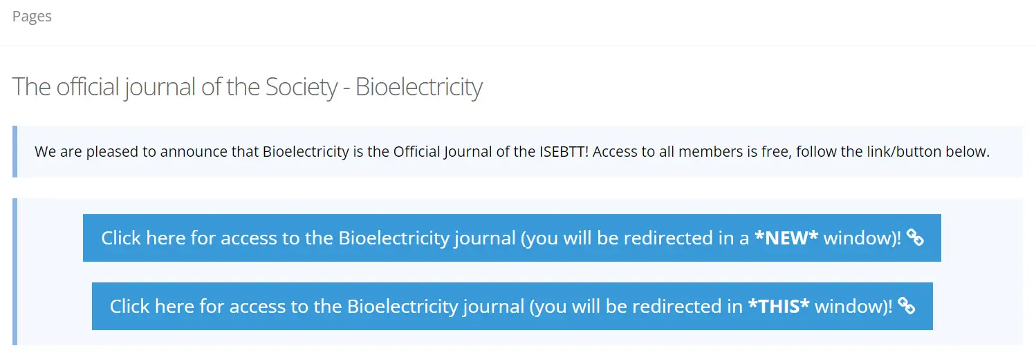 We are pleased to announce that for ISEBTT members, free access to the official journal of the Society is now available via the Member’s only area of the electroporation.net website. Go to isebtt.electroporation.net/p/bioelectricity, and sign in using your member’s credentials, after which you can click one of the two buttons/links that will take you to the Bioelectricity starting page listing all the issues you can browse.